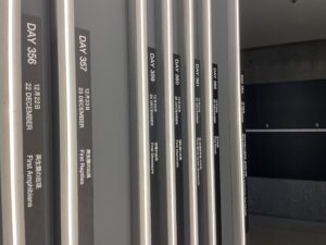 先ほどの目線に合わせる方法を用いた”歴史を歩く”展示ゾーンとは異なり、四角柱には満遍なく文字情報が掲示されています。